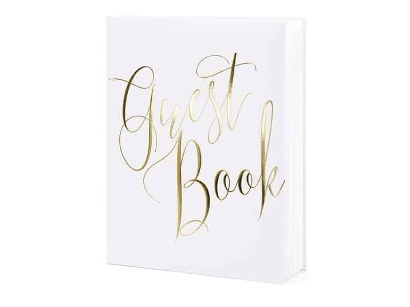 En populær og moderne gjestebok til bryllup med teksten «Guest Book» i pene og elegante gullbokstaver på forsiden.